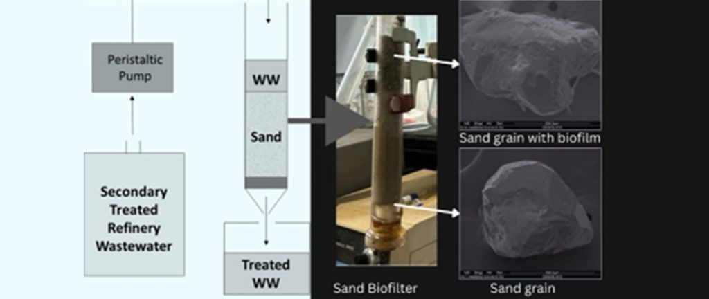 Refinery wastewater flowing through sand produced biofilms of pollutant-eating bacteria which in turn removed the harmful compounds from the water
