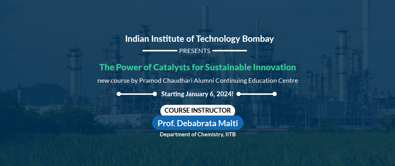 The Pramod Chaudhari Alumni Continuing Education Centre has launched a new course called Harmonizing Industry with Nature: Unveiling the Power of Catalysts for Sustainable Innovation. The course will be offered by Prof. Debabrata Maiti, the recent recipient of the prestigious Shanti Swarup Bhatnagar Prize 2022 from IIT Bombay’s Chemistry Department.